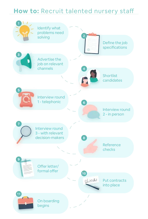 Remember that nursery staff retention starts with a proper recruitment process. You need to give your business a fighting chance from the word ‘go.’ We’ve summed up the hiring process for you in this flow diagram below.