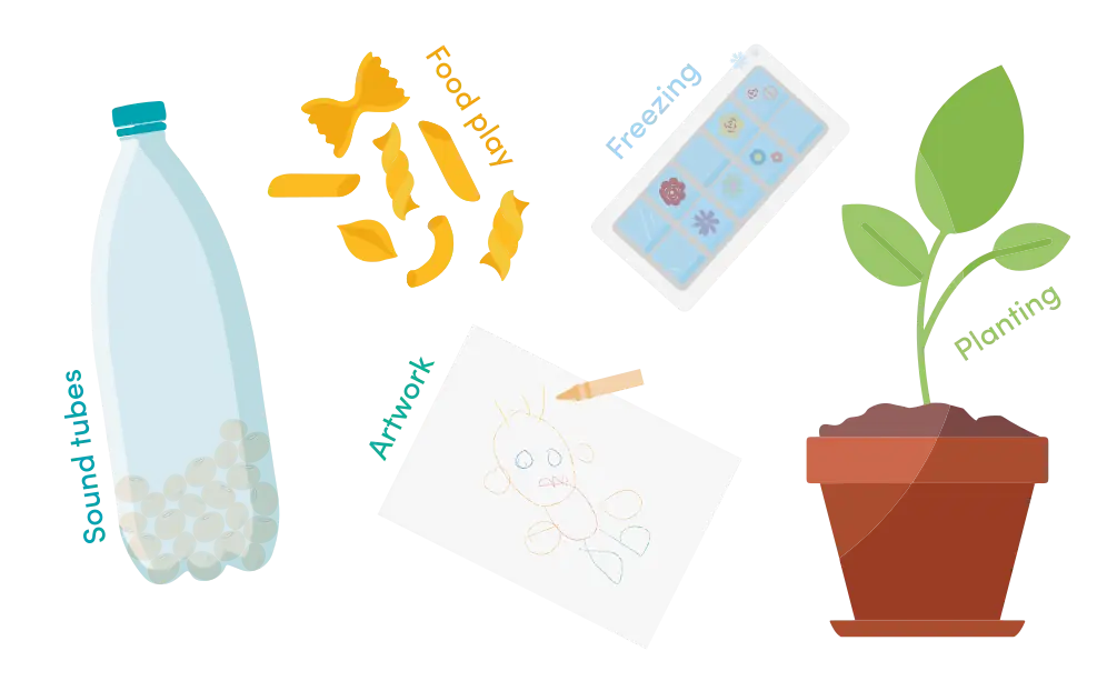 You can add small objects (sequins, small toys, shells, buttons) into a large bottle and fill it two-thirds of the way with dry rice. The children will shake the bottle to try to find the objects. It can be useful to record which items you put in as you do it to create a checklist for searches.