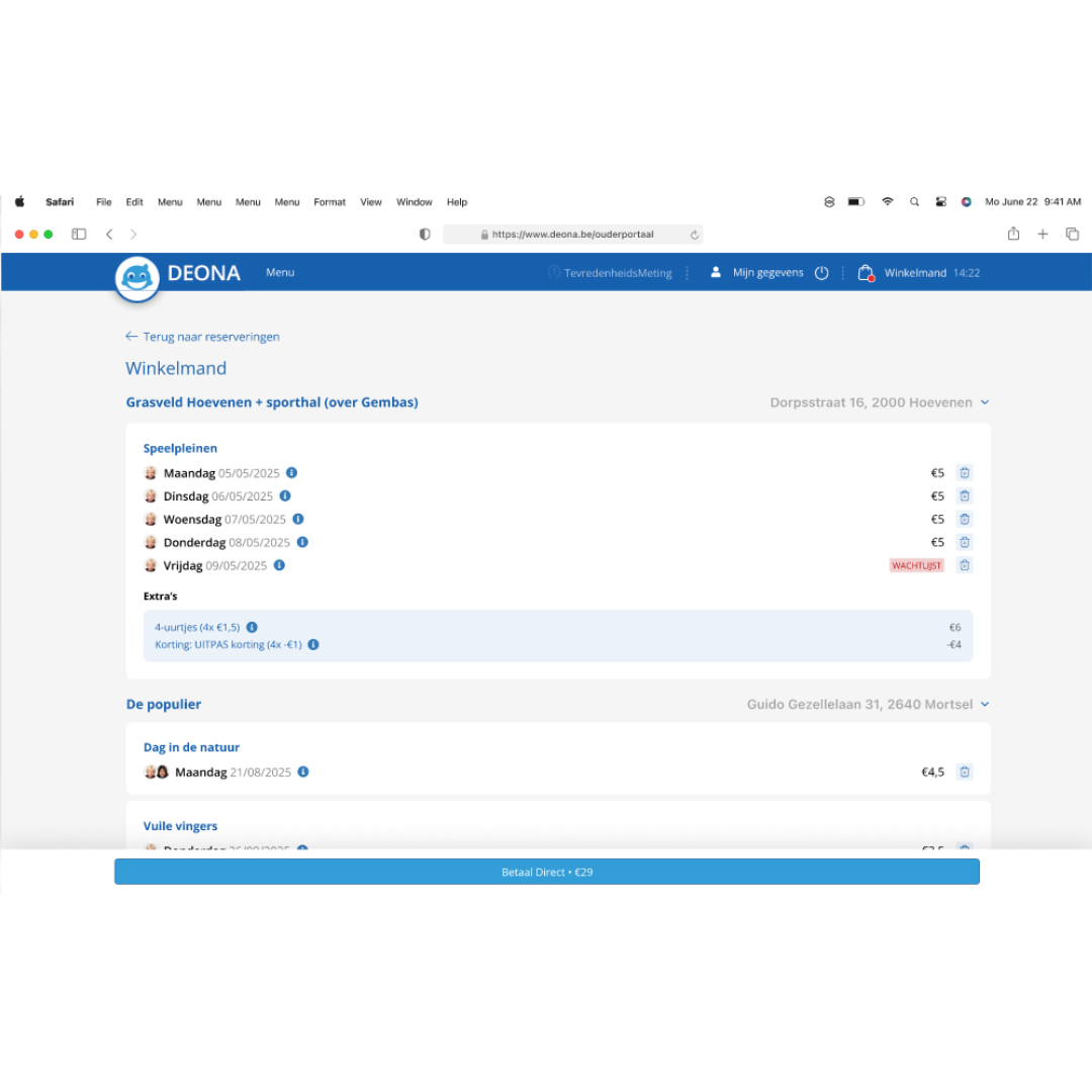 Ouders kiezen de activiteiten die perfect bij hun gezin passen en bewaren ze tijdelijk in het winkelmandje. Zo hebben ze rustig de tijd om het volledige aanbod te bekijken en hun keuze te verfijnen. Wanneer ze klaar zijn, kunnen ze online afrekenen. Hierbij wordt de prijs inclusief kortingen en extra’s automatisch berekend en weergegeven, zodat alles transparant en overzichtelijk blijft.