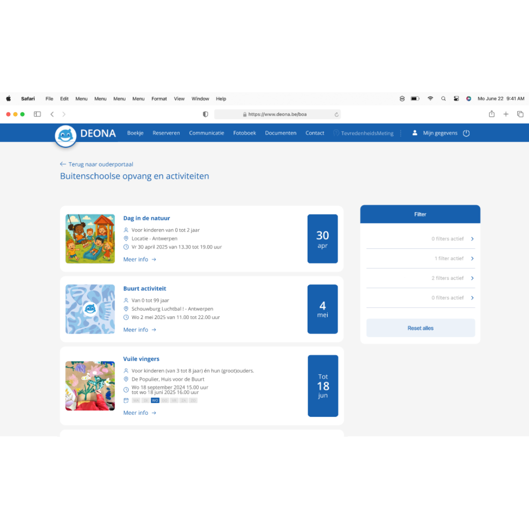 Toon je volledige aanbod in een overzichtelijk BOA-portaal dat aansluit bij de huisstijl van jouw lokaal bestuur. Dankzij de filters vinden ouders snel wat ze zoeken. Het BOA-portaal koppelt naadloos met het Deona reservatiesysteem of met een externe reservatietool. Ook lokale actoren zonder beheersysteem krijgen hun plaatsje op het BOA-portaal.
